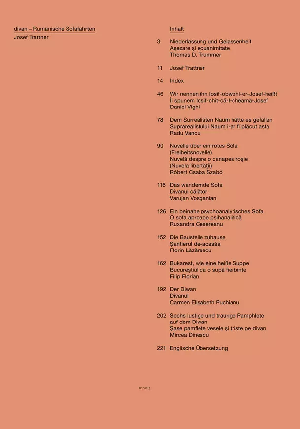 Für seine Sofafahrten verwendet Josef Trattner von ihm selbst entworfene, leicht transportable Schaumstoffsofas. Im Sommer 2012 reiste er damit nach Rumänien, traf sich mit ansässigen oder ortskundigen Schriftsteller:innen, führte mit ihnen Gespräche, lud sie zu Sofa-Wanderungen und -Lesungen im öffentlichen Raum ein und dokumentiert nun mit den Texten der Autor:innen und mit seinen Fotos diese intensive Reise ins Innere eines immer noch unbekannten Landes. Das sesshafte Möbel, das der Künstler und seine Autor:innen schultern, wird zur Metapher ihrer Existenz.