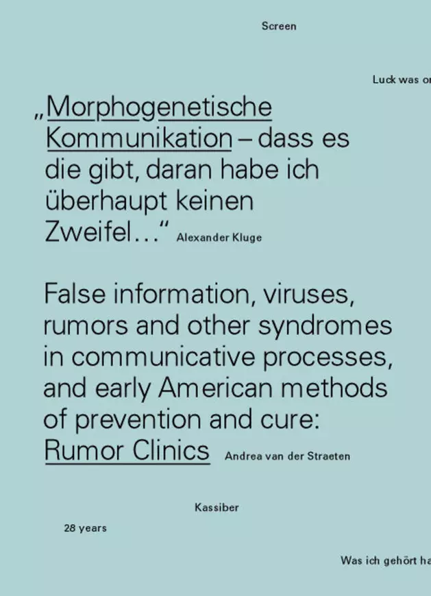 „Rumor-Clinics / Gerüchte-Kliniken – Über Fehlinformationen, Viren, Gerüchte und andere Krankheitsbilder in kommunikativen Prozessen und über frühe amerikanische Präventiv- und Heilungsmethoden“ ist das Ergebnis ihrer Recherche zu einer skurril erscheinenden politischen Institution in den USA, deren bedrohliche Aktualität einem Science-Fiction-Märchen entnommen scheint. In einem langen Gespräch mit dem Autor, Regisseur und Produzenten Alexander Kluge vertieft sie diese medien- und erzählkritischen Ansätze. Dass „wir uns einen Erzählraum schaffen müssen, in dem wir uns reparieren können“ ist Kluges Ausgangsthese: „Morphogenetische Kommunikation – dass es die gibt, daran habe ich überhaupt keinen Zweifel.“