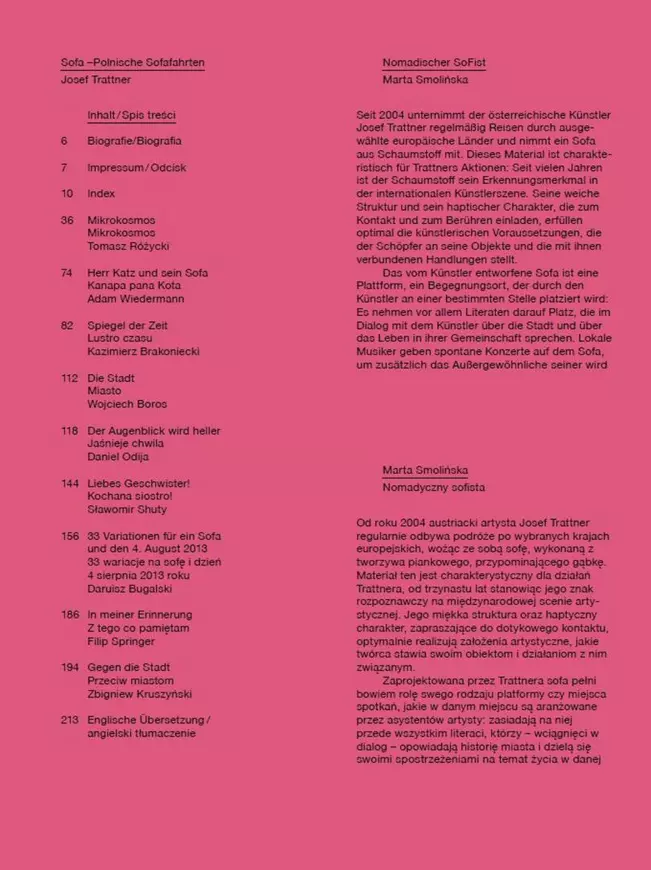 Seit zehn Jahren geht Josef Trattner mit seinen selbst entworfenen, aus leichtem Schaumstoff gefertigten Sitzmöbeln auf Sofafahrten. 2013 führte ihn die Reise nach Polen: International bekannte polnische Schriftsteller ebenso wie über die Grenzen Polens hinaus noch wenig rezipierte junge Autoren nahmen auf Trattners Sofa Platz, immer wieder auch Musiker, Journalisten und Fotografen. Trattner gelingt so eine doppelte Vermittlungsleistung zwischen bildender Kunst und Literatur sowie zwischen Bekanntem und (literarischem) Neuland. Die Sofas wechseln ständig ihre Plätze im öffentlichen Raum, wodurch Trattners Gesprächspartner zu Gästen in ihren eigenen Städten werden.