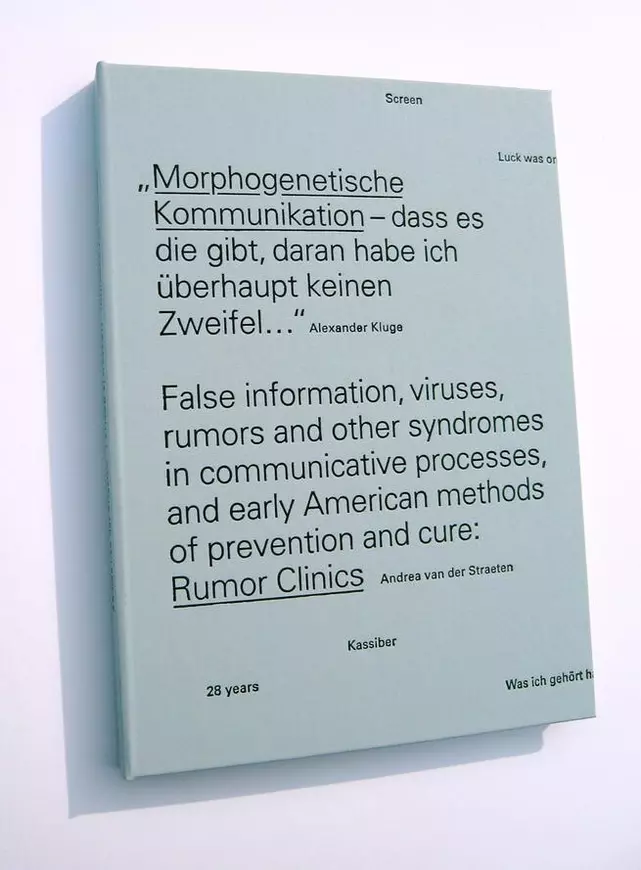 „Rumor-Clinics / Gerüchte-Kliniken – Über Fehlinformationen, Viren, Gerüchte und andere Krankheitsbilder in kommunikativen Prozessen und über frühe amerikanische Präventiv- und Heilungsmethoden“ ist das Ergebnis ihrer Recherche zu einer skurril erscheinenden politischen Institution in den USA, deren bedrohliche Aktualität einem Science-Fiction-Märchen entnommen scheint. In einem langen Gespräch mit dem Autor, Regisseur und Produzenten Alexander Kluge vertieft sie diese medien- und erzählkritischen Ansätze. Dass „wir uns einen Erzählraum schaffen müssen, in dem wir uns reparieren können“ ist Kluges Ausgangsthese: „Morphogenetische Kommunikation – dass es die gibt, daran habe ich überhaupt keinen Zweifel.“