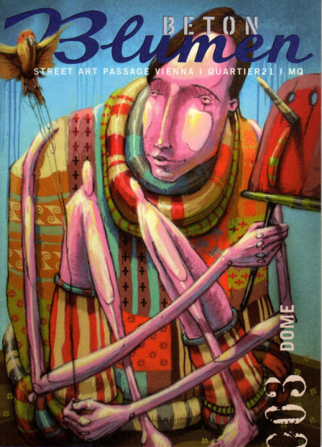 In his paintings Christian Krämer (*1975, Karlsruhe) alias “DOME” sees behind the curtain made of clothes, status symbols and masks which people create to protect themselves, as matter of vanity or assimilation. Underneath the folkloristic and colourful patterned bunches of clothes and headdresses the artist is showing fragile and fleshly beings who seem to be exhausted and marked by life. The slender limbs of the delicate, pink characters remind of the frail legs of an insect or marionettes with filament. They interact in distance to each other, rest in melancholic meditation or play music lonely in the penurious landscapes of drought trees and single flying birds where they are situated.